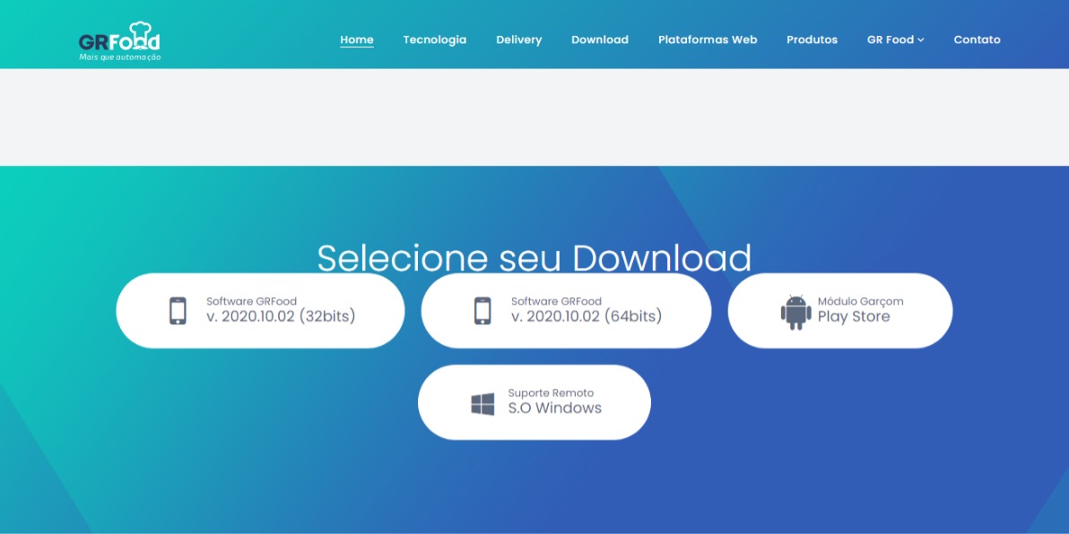 Acesse o site do GRFood e clique no menu "Download" para ter acesso aos instaladores do sistema.